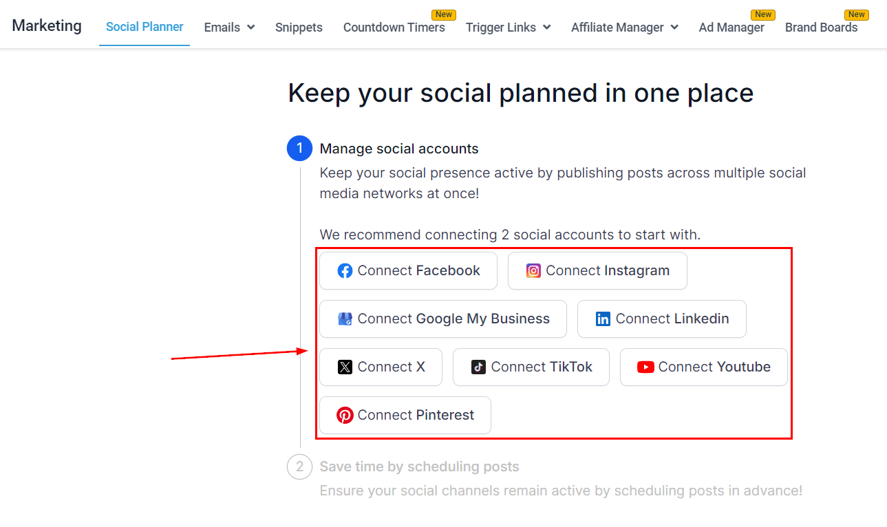 If you haven't connected any social media accounts, navigate to the Social Planner tab inside the Marketing section.