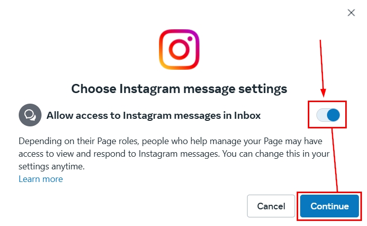 Toggle Allow access to Instagram messages in Inbox then click Continue.