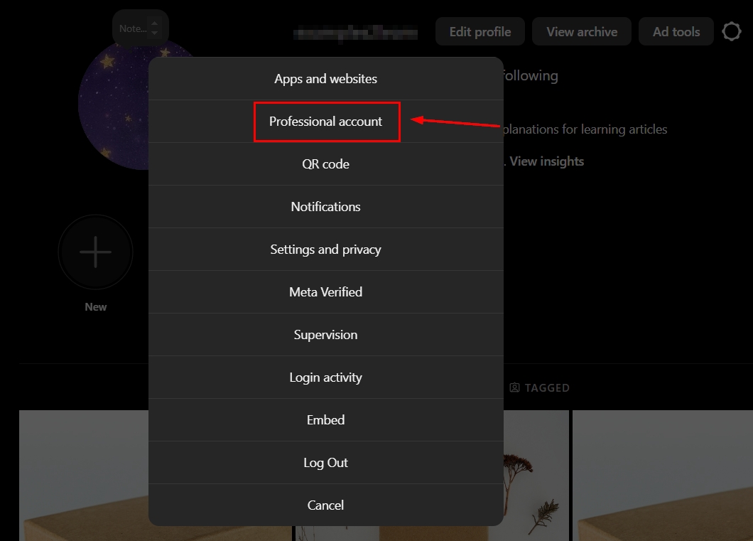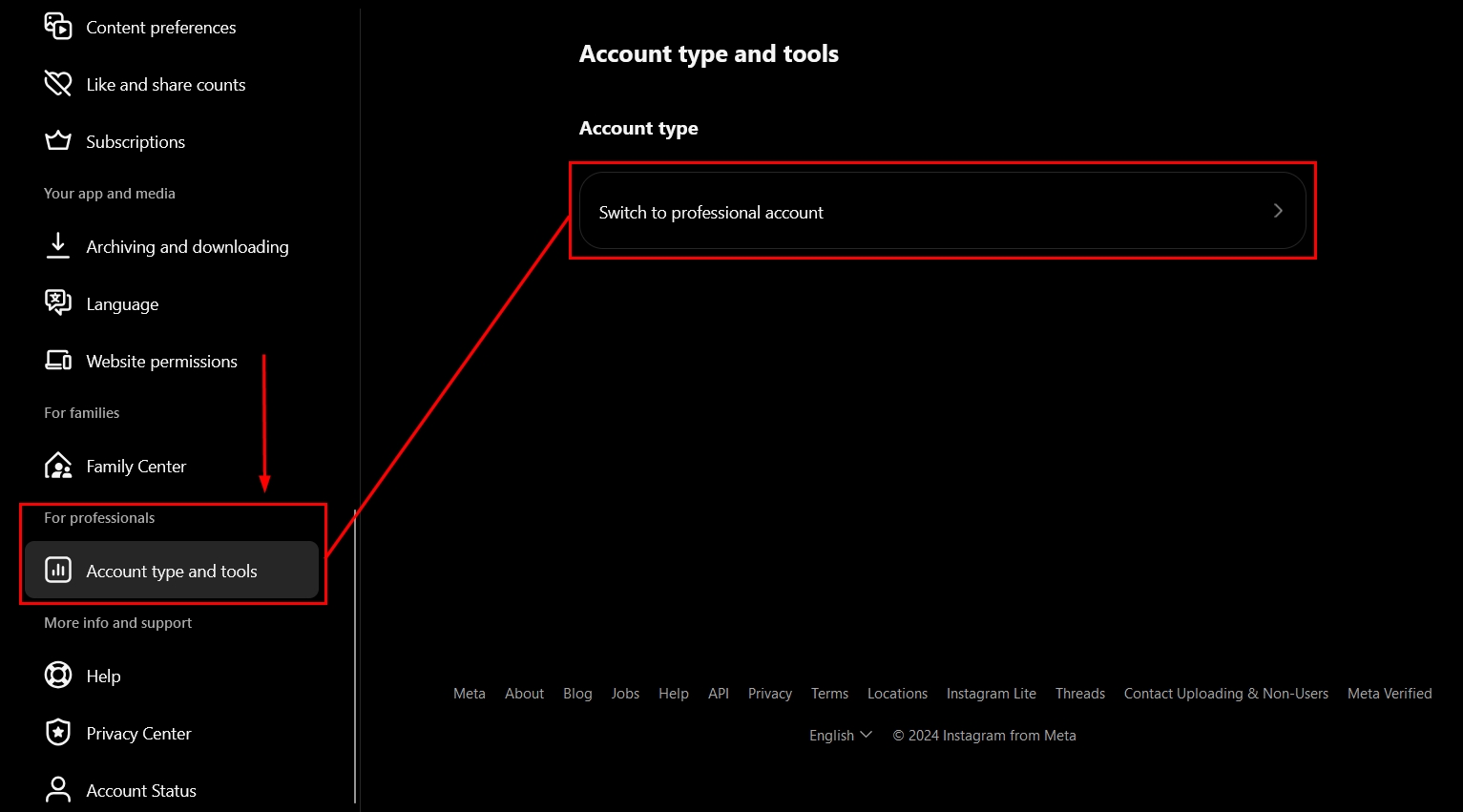 Scroll down to For Professionals and select Account type and tools, there you can switch to a Professional Account.