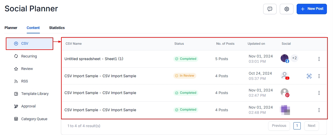 The CSV section displays all posts created through CSV file uploads. It provides columns for the CSV file name, upload status, number of posts, last updated date, and associated social accounts, enabling efficient management of each post.