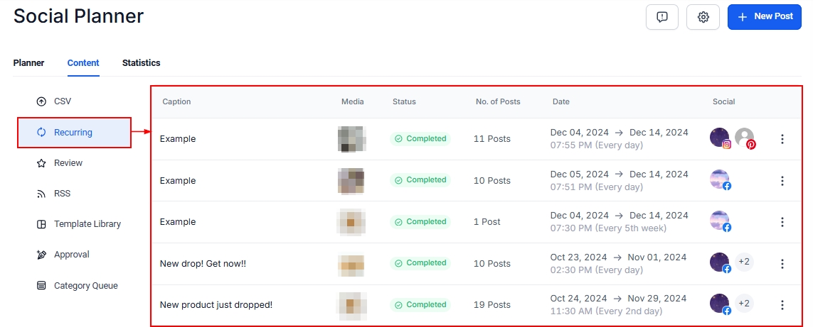 In the Recurring section, you can view posts scheduled for repeated posting, along with key details such as the post caption, media, status, number of posts, date range, posting frequency, and linked social accounts. Click the actions dropdown next to the relevant post to create a duplicate.