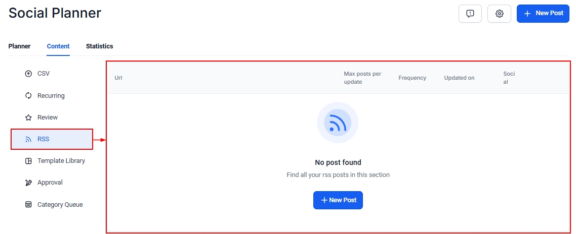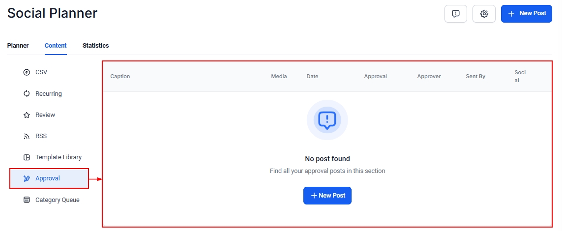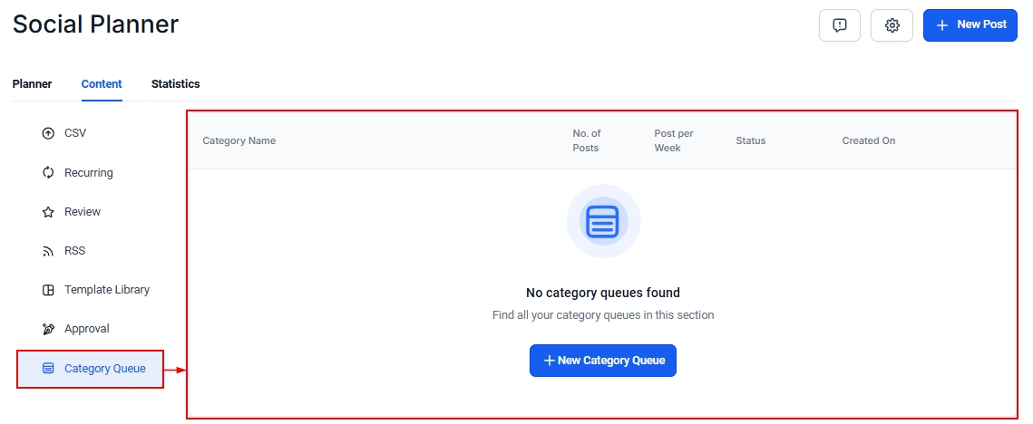 Use this feature to manage, review, and schedule posts efficiently while accessing settings, creating new posts, and handling approvals, and Category queues seamlessly.