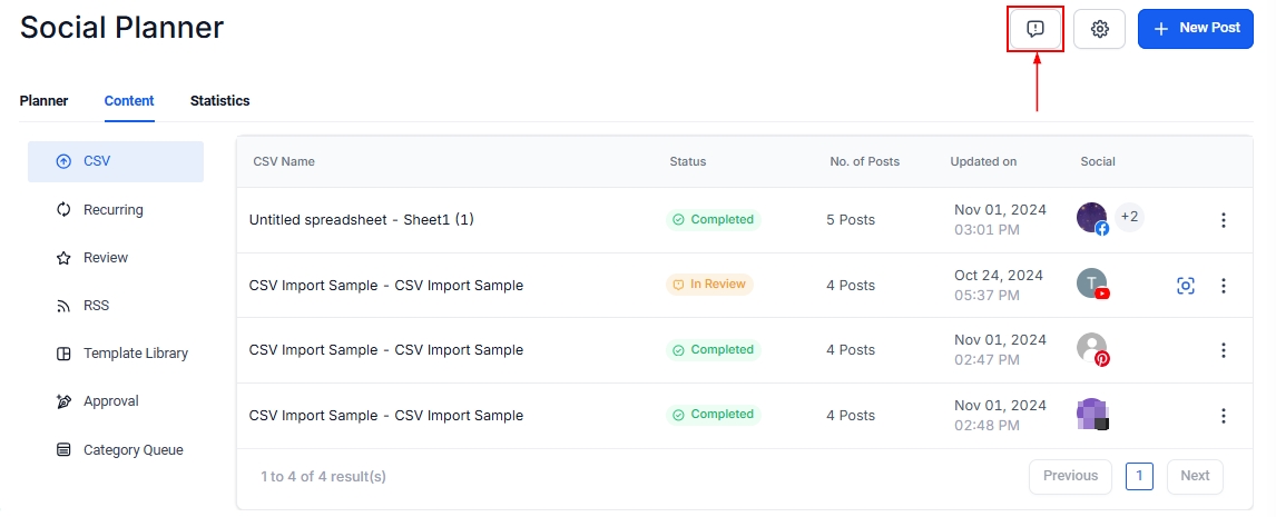 This section displays your saved templates, allowing you to view the associated CSV name, template status, last updated date, and the social accounts where the template has been posted.