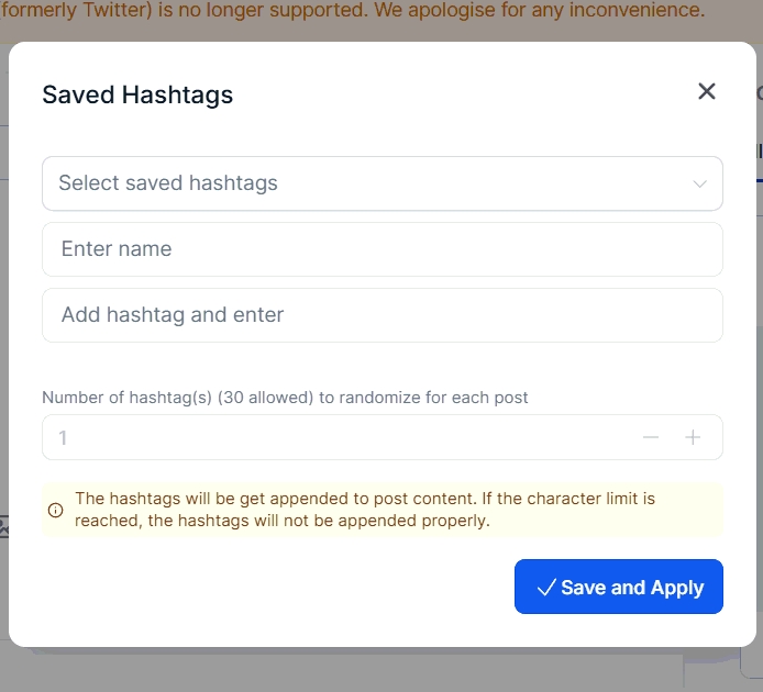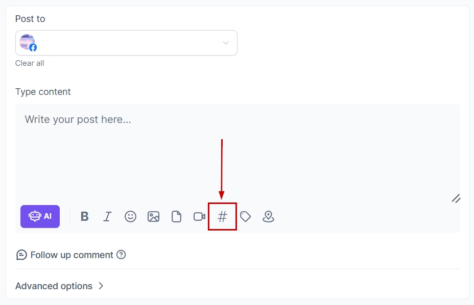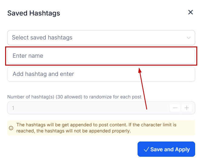 Within the Post interface, you can add hashtags, by clicking the # symbol which triggers a pop-up that prompts you to provide details for the new hashtag group.