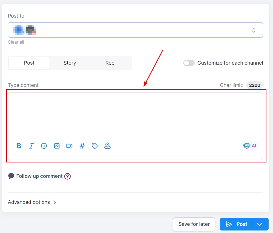 Add the content as normal, type in your caption and hashtags, or click the robot icon to use the AI tool to aid you in the content creation. Get creative with adding formatting elements like bolded and italicized text. Or add media by clicking on the camera/picture frame icon.