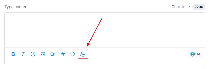 Click on the pin icon to add the location, here you can tag the place or location of your post. Keep in mind this feature is only available for Facebook and Instagram.