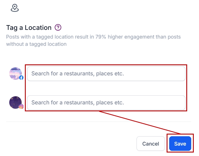 This will open a pop-up for you to search for the desired location. Once you've selected it click save to add it to the post. You will have to pick a location for each social, for example when doing FB and IG you'll have to select a location for each.