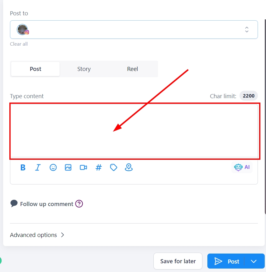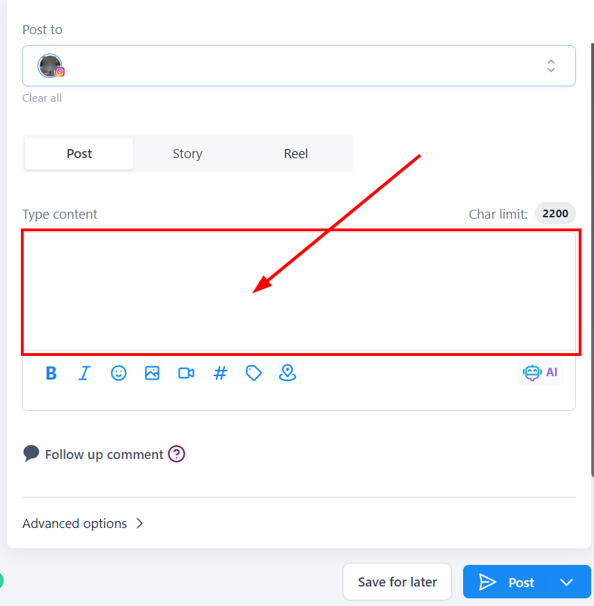 Type in the text content you'd like to publish. You can also add rich media, hashtags, and more in this field.