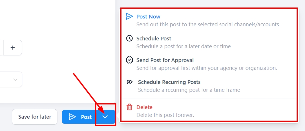 When you click on the "Post" button, it gives you three (3) different sending options and delete options to choose from: