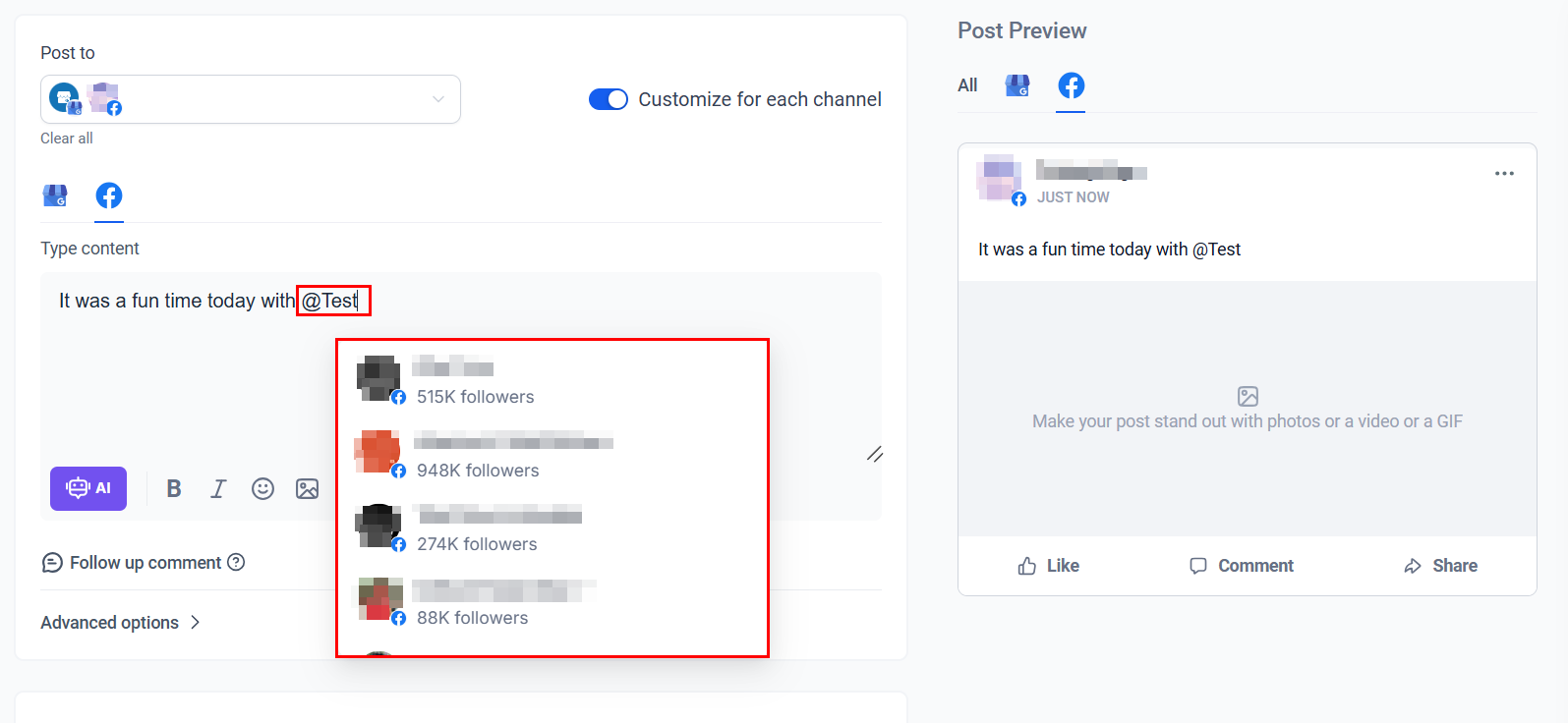 If you’re posting to multiple platforms, enable the option to Customize for Each Channel to tailor the mentions to the platform.