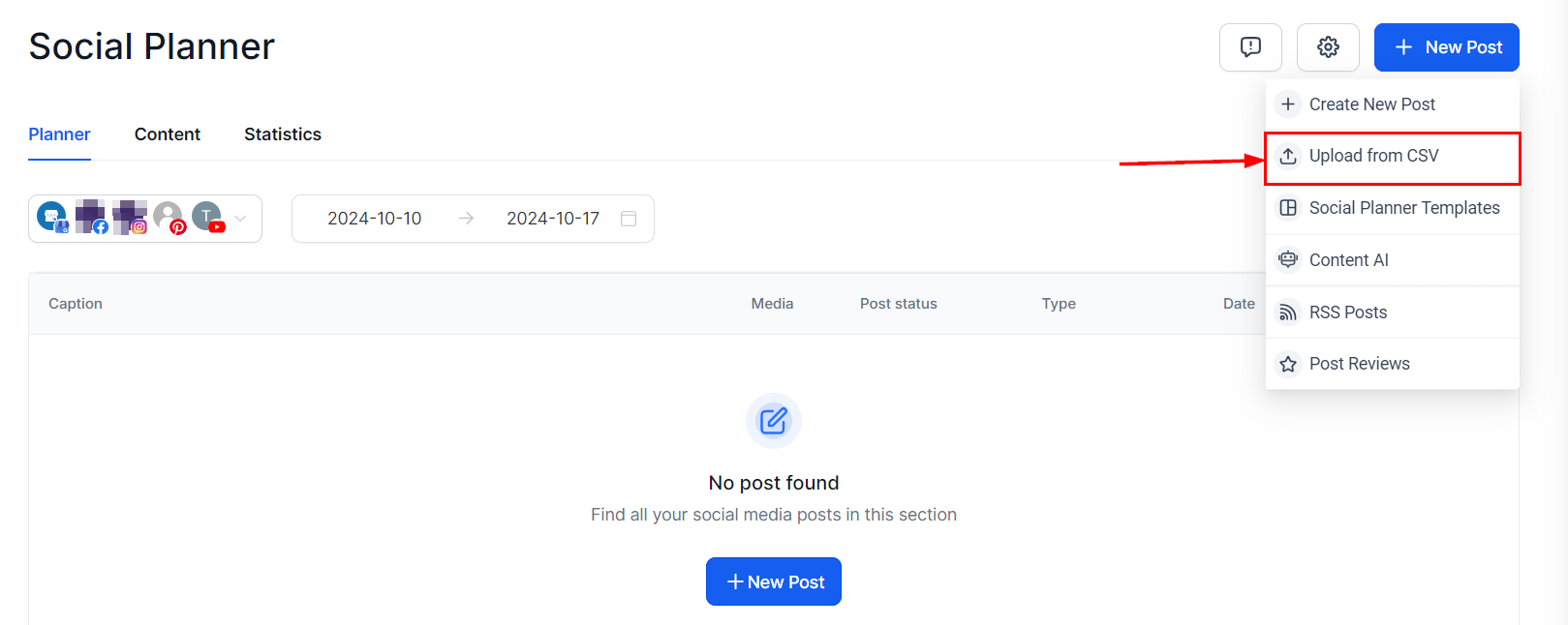 To upload posts in bulk using a CSV file click the "New Post" button and select "Upload from CSV."
