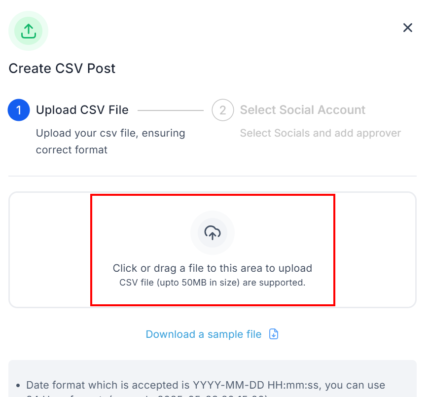 Ensure that the CSV follows the required format. A maximum of 90 posts can be uploaded per CSV file.