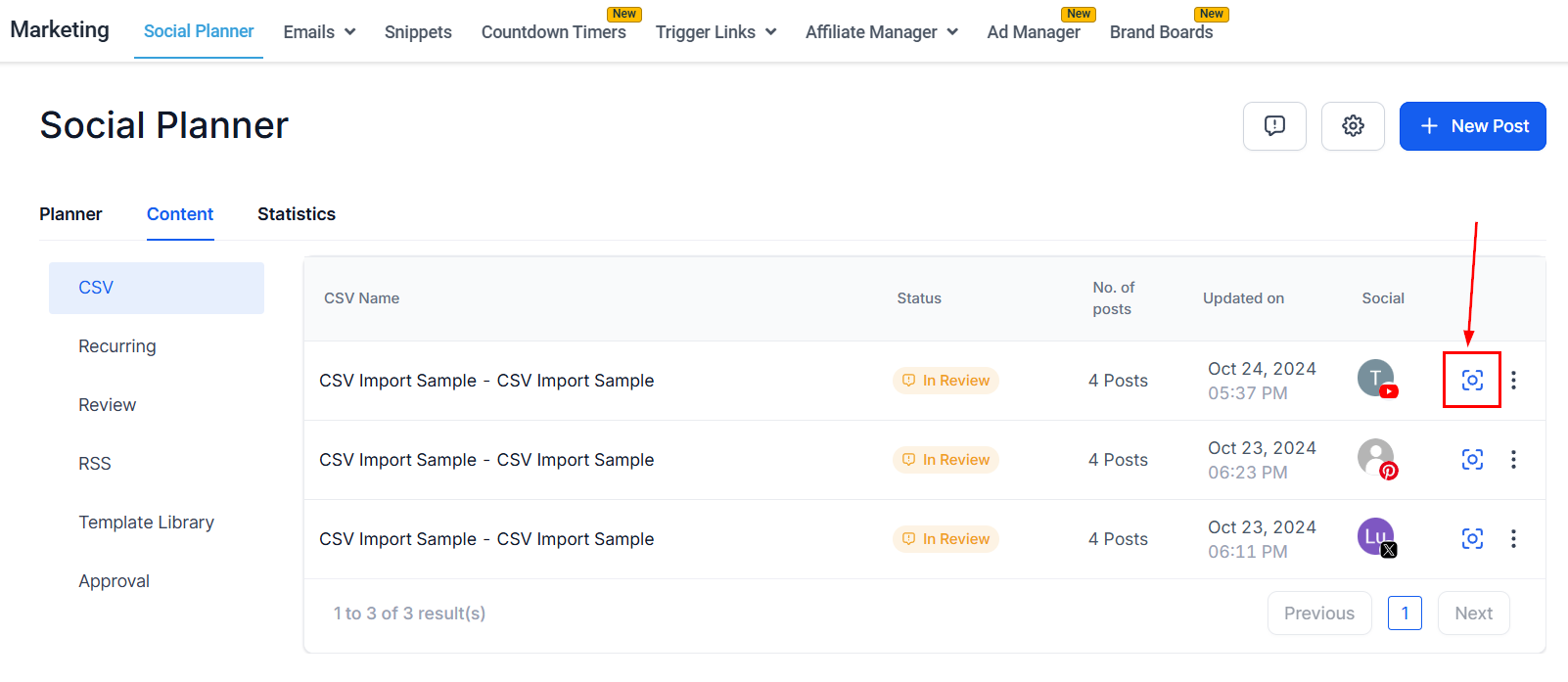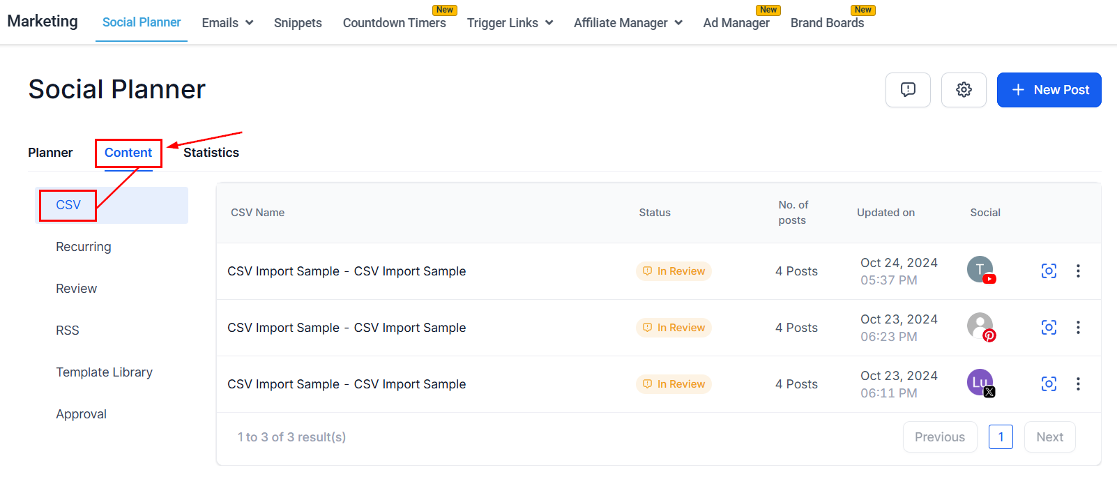 Head to the Content tab inside the Social Planner of the marketing section and select CSV to monitor the importing process. There will be two possible statuses for recently uploaded files: