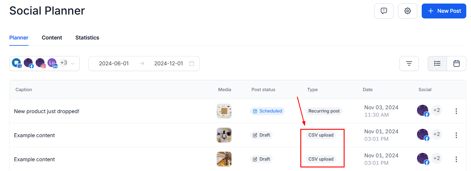 The Social Planner dashboard distinguishes posts from CSV uploads and those from Post Composer.