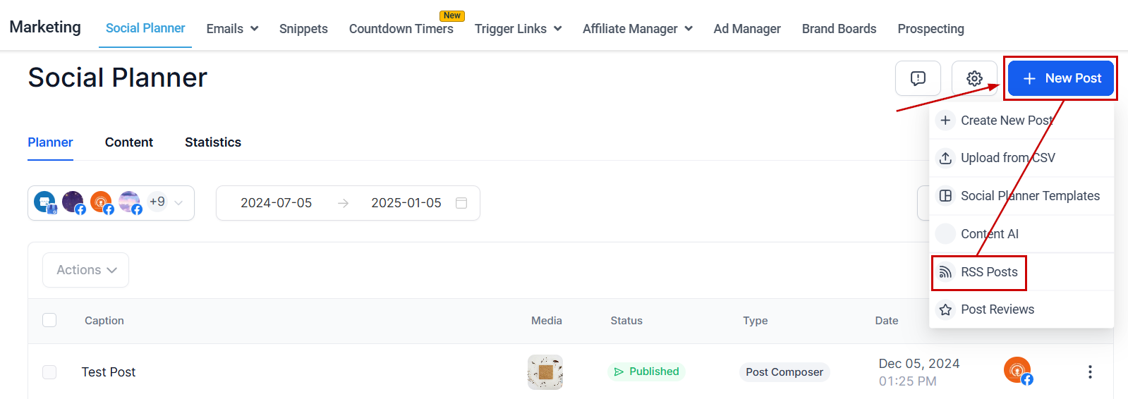 Navigate to the Social Planner tab inside the Marketing section. Click "New Post" and select the "RSS Post" option.