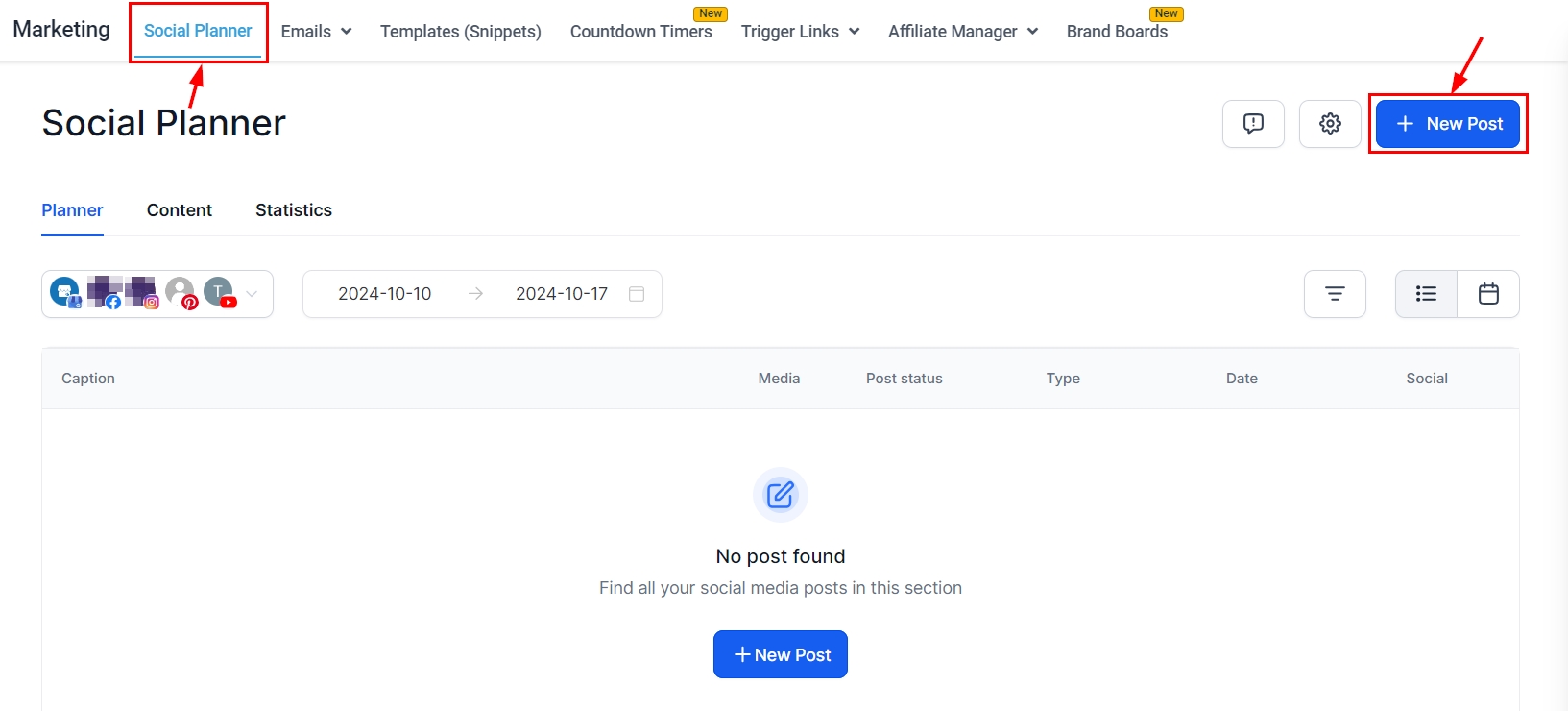 Start by going to the “Marketing” tab in the left sidebar then to the Social Planner. Here, create a new post from scratch, the template library, or upload from a CSV.
