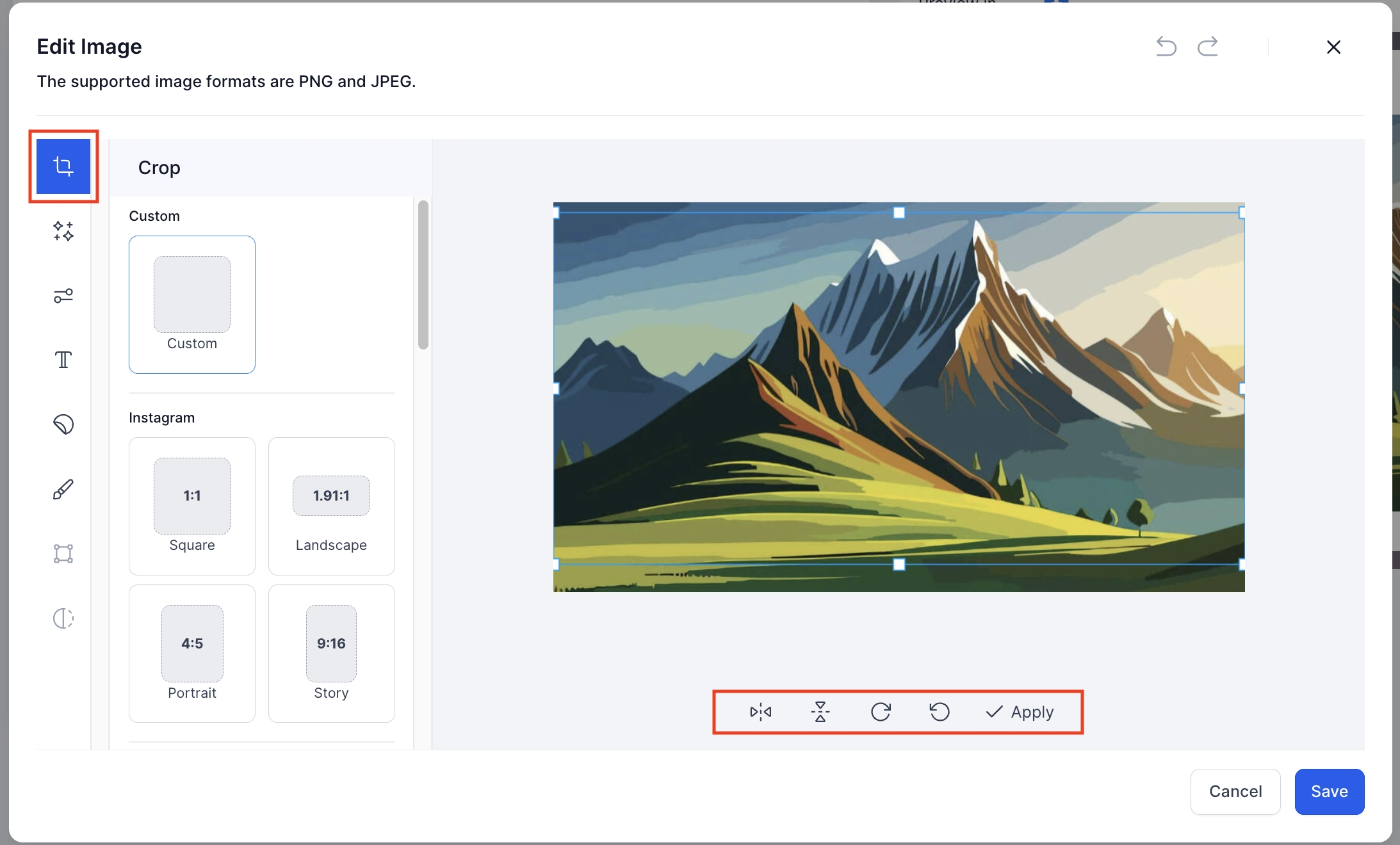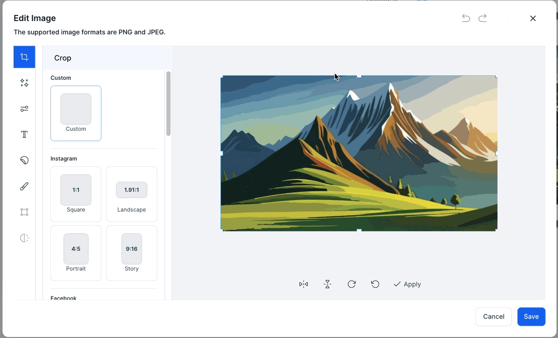 The Social Planner's editor allows for advanced image editing that is designed to enhance your social media strategy. This tool provides versatile options for creating visuals tailored to different platforms. Let's take a look at how to navigate these features to assist your content creation process.