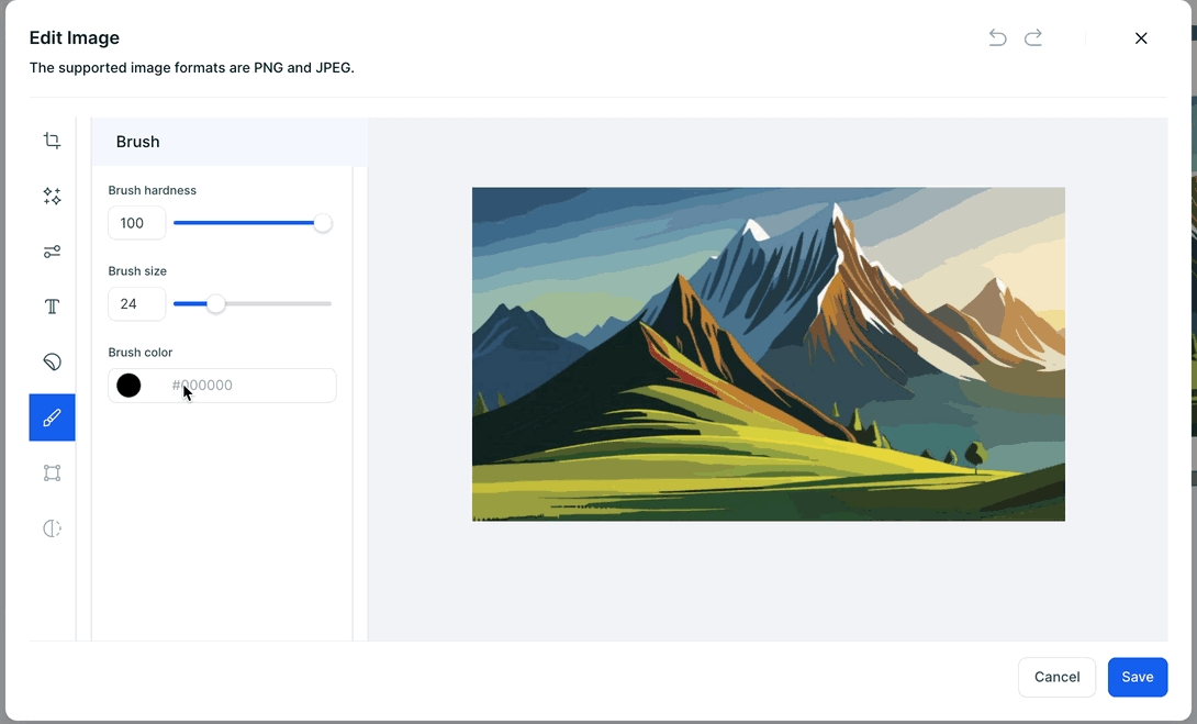 The brush allows you to adjust the brush's hardness, brush size, and color. Once you have adjusted these settings, you can draw on your image!
