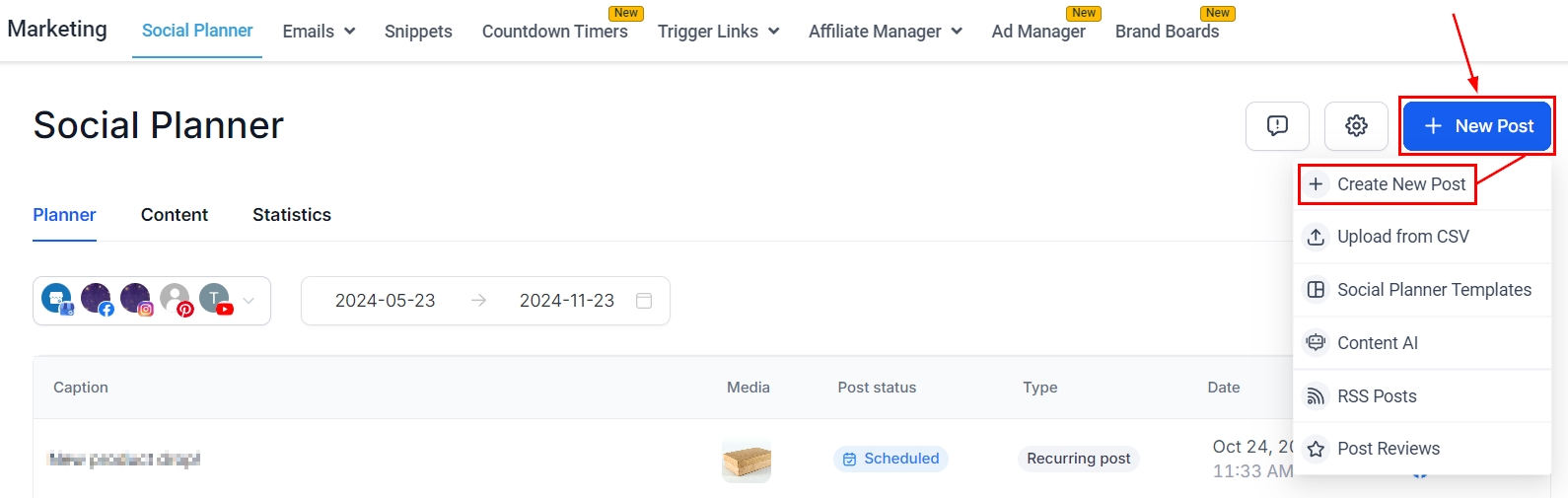 Navigate to the Social Planner tab inside the Marketing section and create a new post. To do so, click “+New Post” then select “Create New Post”.