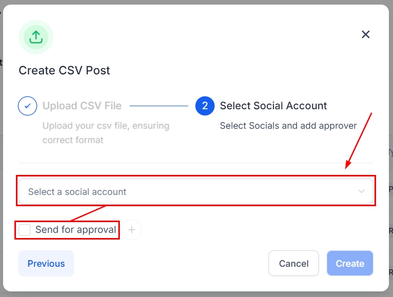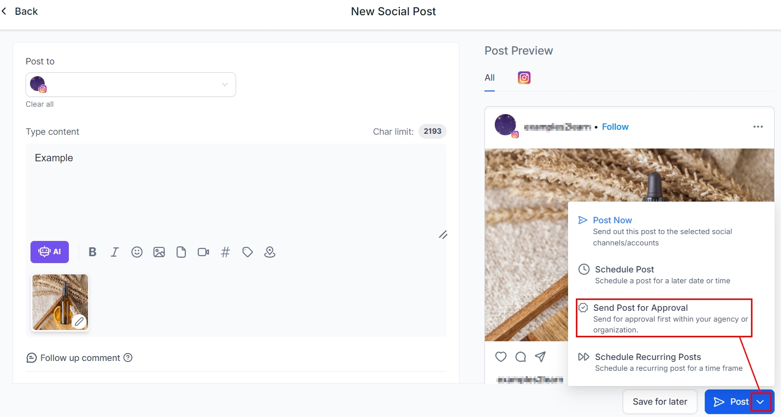 Select the socials you'll be posting to, then check the box next to Send for approval.