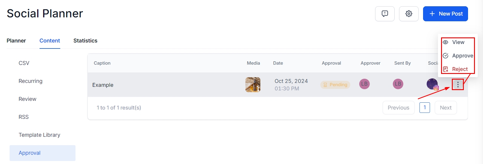 The “View” option will allow users to view the details of posts and then approve or reject them. The reviewer team member can edit the content for the approval flow by clicking "Edit" on the view screen.