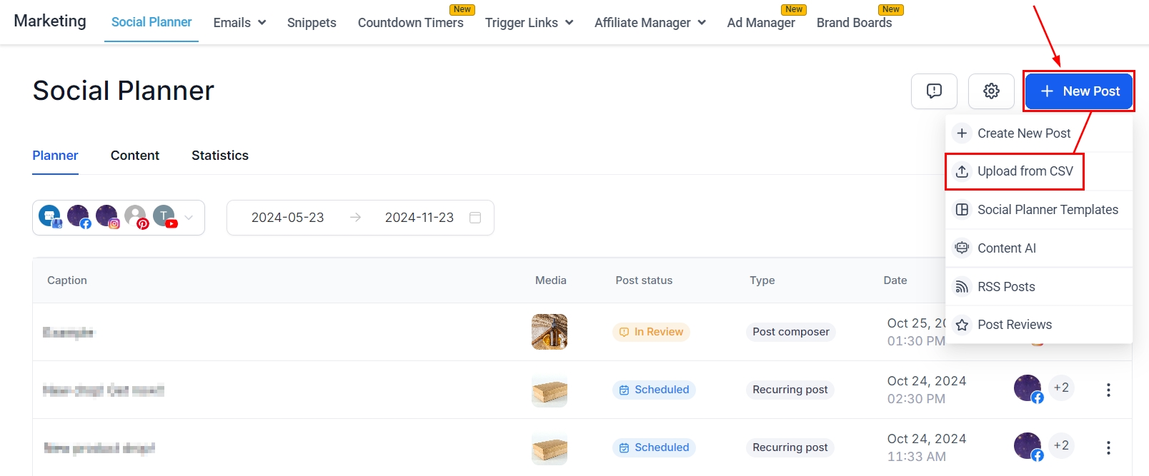 Navigate to the Social Planner tab in the Marketing section and click “Upload from CVS” for a bulk import.