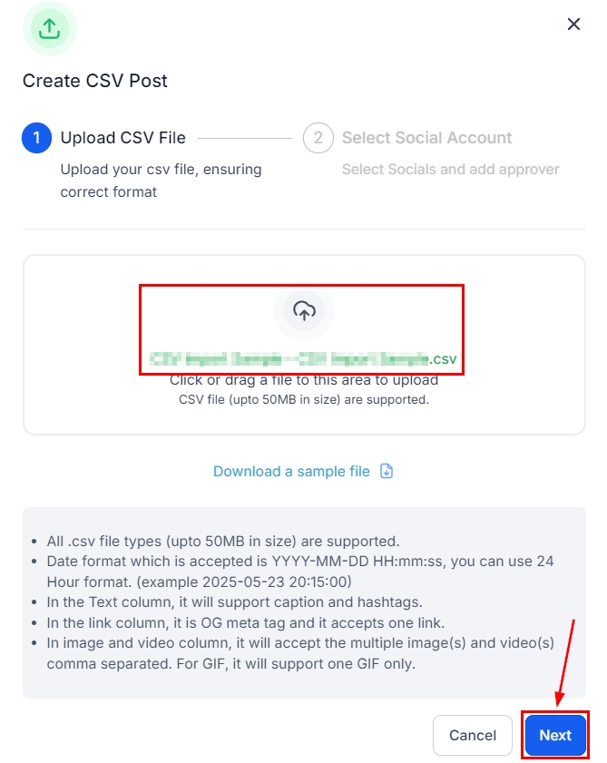 Upload your CSV file as normal then click Next. If you've never done it before we recommend clicking “Download a Sample file” to use as a template for setup.