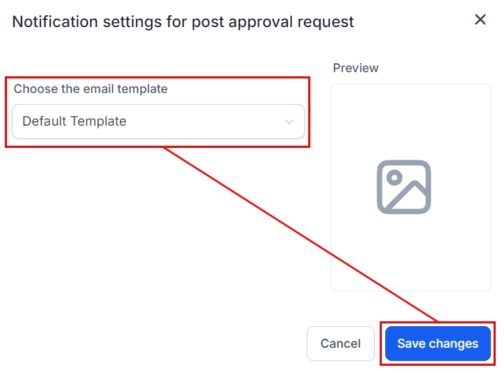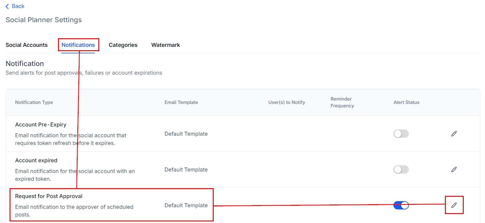 Go to the Notifications tab and click on the pencil icon next to Request for Post Approval