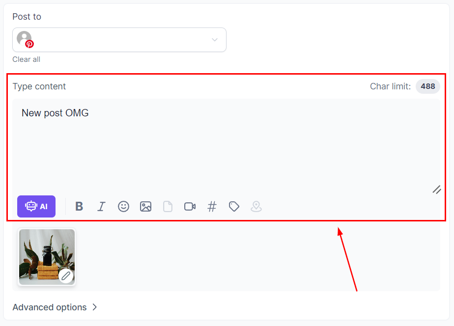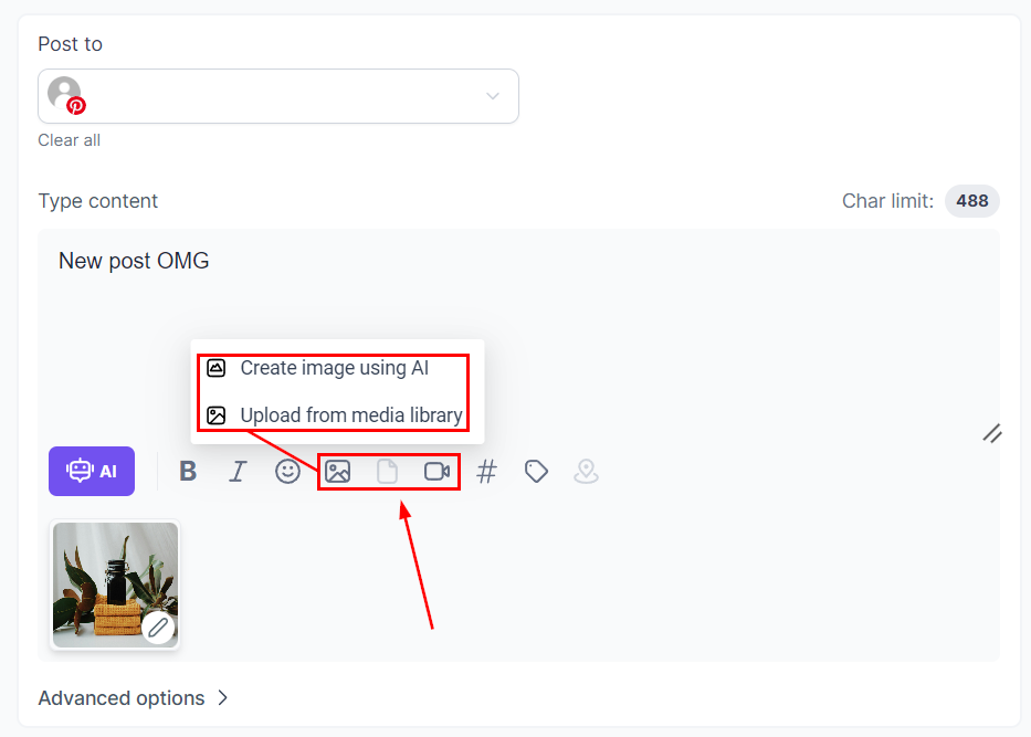 Pinterest requires 1 image or 1 video to create a pin. To add your media click on either the picture frame or video camera. Once clicked you can generate it using AI or add it from your media library.