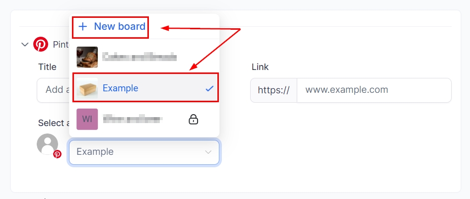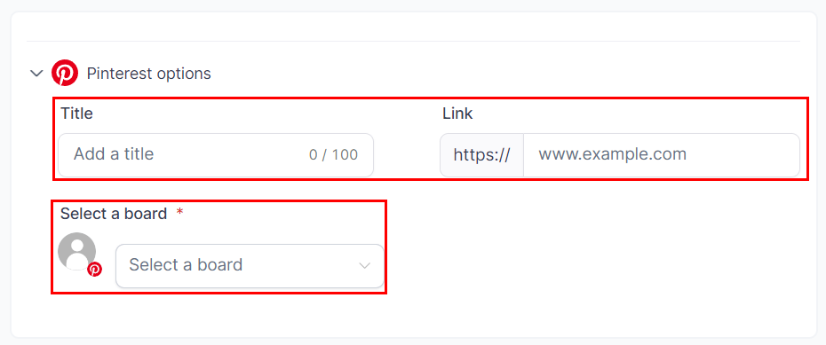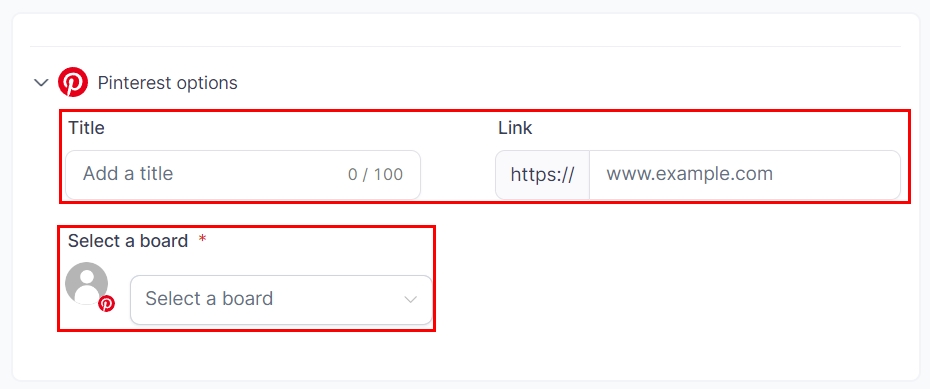 For pins, you can add a title, as long as it's under 100 characters, or add links to your post. You will be prompted to select the Pinterest board.