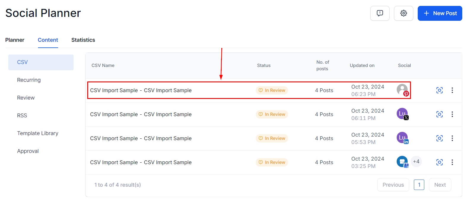 After the posts are imported by clicking on Process CSV, they need to be reviewed by the chosen approver. Once approved, they are scheduled on the social calendar. If no approver is selected they will be scheduled directly.