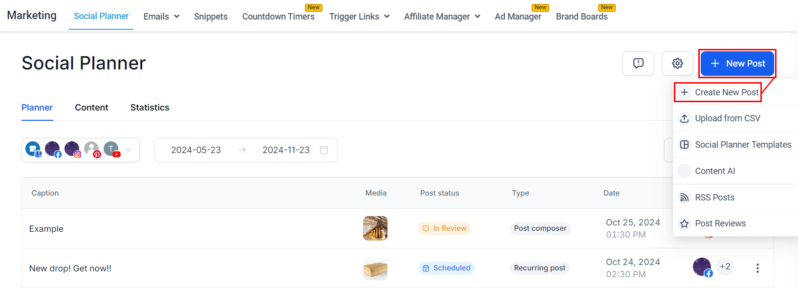 Start by clicking “New Post” in the top right corner. Select “Create New Post.” Alternatively, there's a "Create New Post" link at the bottom of your posts list.