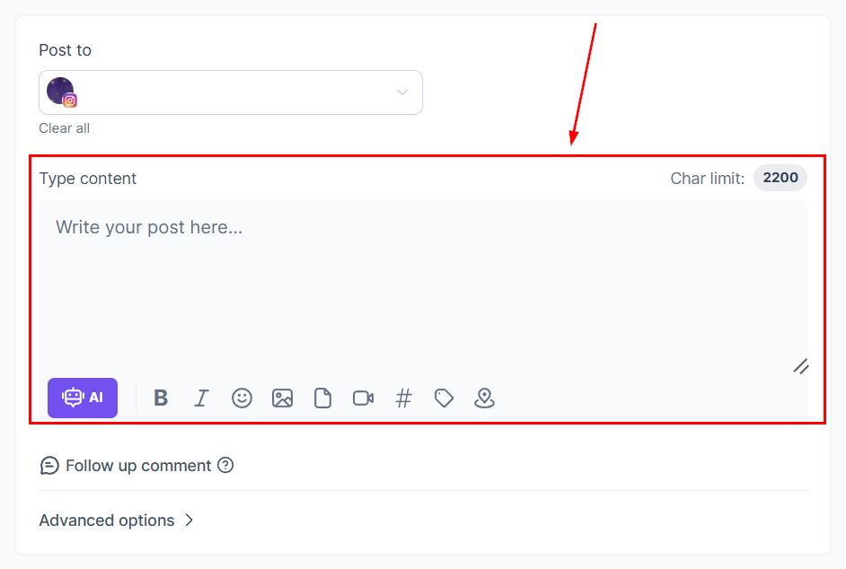 Write in your caption and hashtags, or click the robot icon to use the AI tool to aid you in the content creation. We recommend keeping the caption short since it will be shown directly underneath the video.