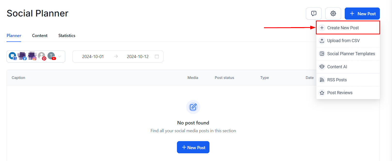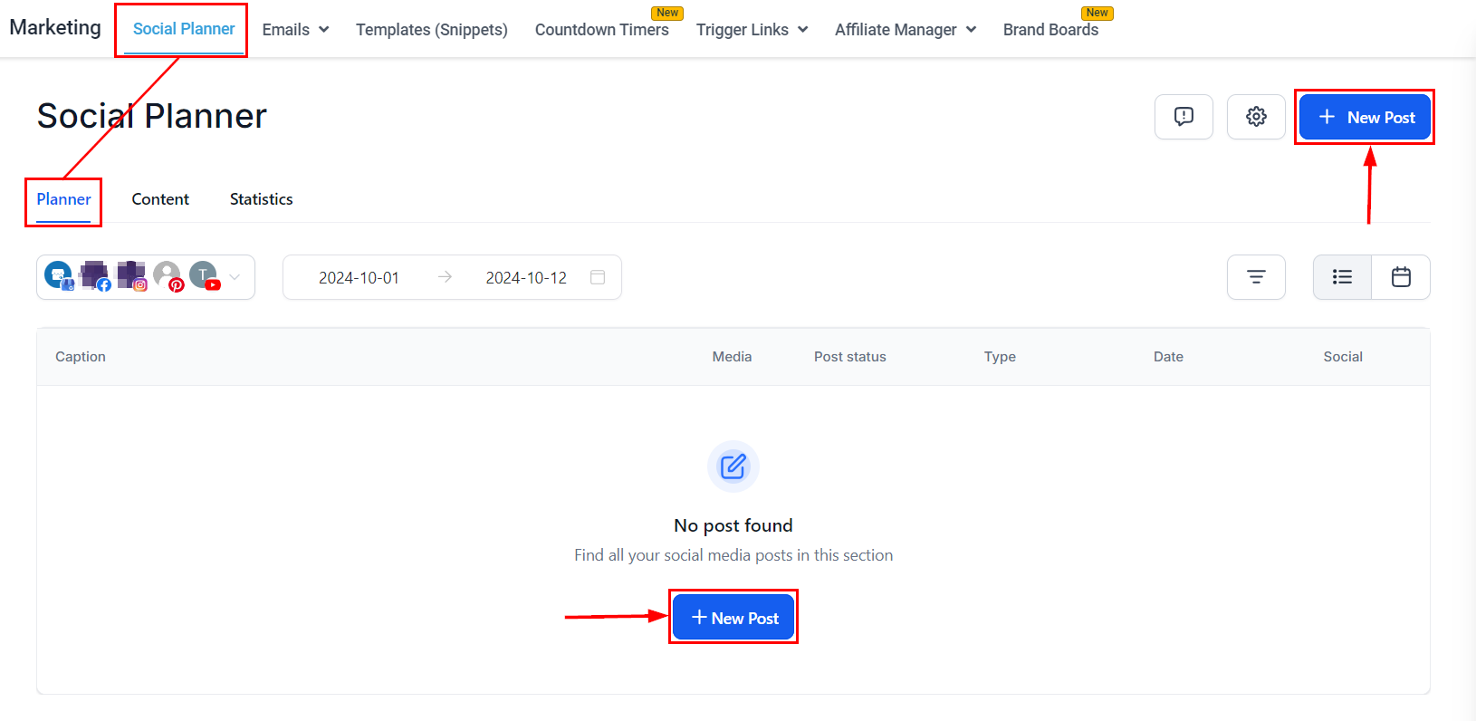 To publish a Facebook post, navigate to the Social Planner within the Marketing section of your account, then click the blue "New Post" button.