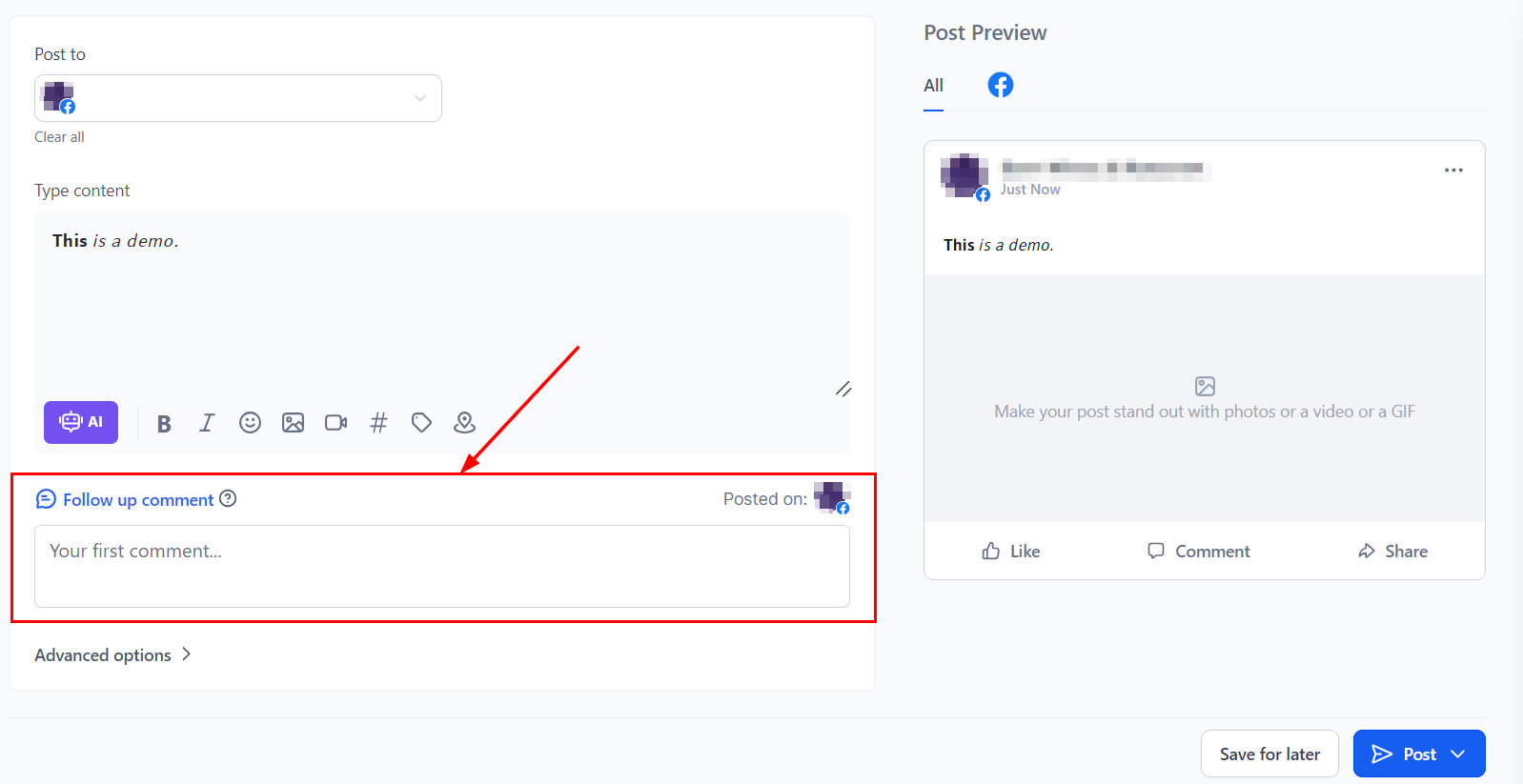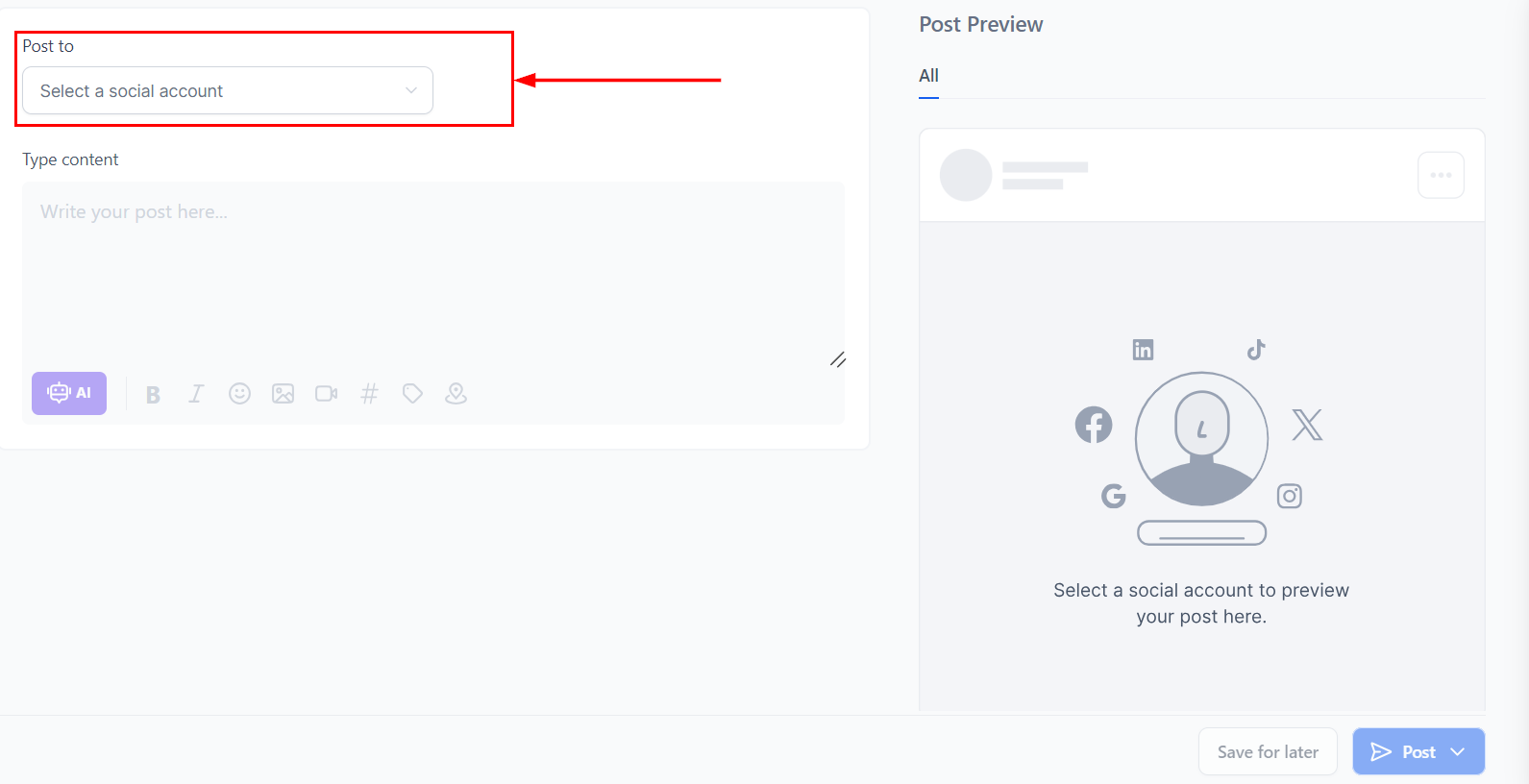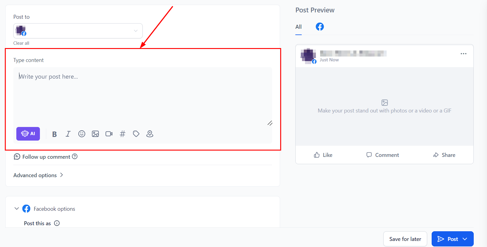 From the "Post To" dropdown menu, select the specific Facebook account where you would like to publish the post. This dropdown will display all the linked Facebook accounts associated with your platform, allowing you to choose the correct one for your intended audience.