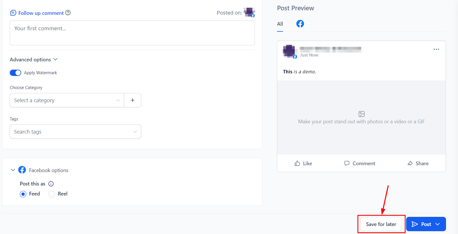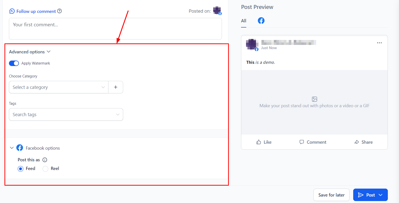 Under Advanced Options, you can apply your watermark to images, choose categories for better organization, and add tags to enhance searchability and categorization of posts. Furthermore, you can choose whether your post should be published on your feed or as a reel.