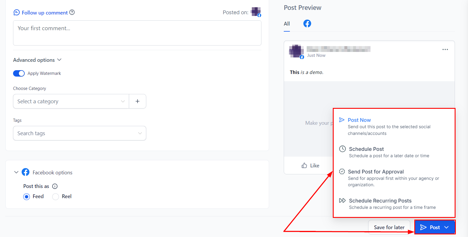 Schedule Post: This will allow you to schedule a post for a later date or time. Choose the date and time from the calendar and time slot.
