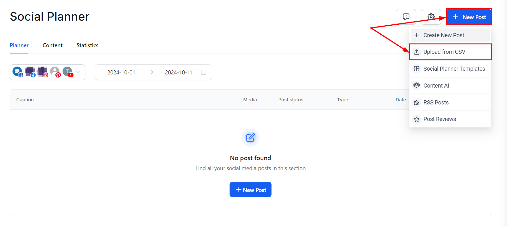 You will then be presented with multiple posting options such as using Social Planner Templates, or Content AI. This guide will walk you through creating a new post and uploading a CSV file to publish a Facebook post.