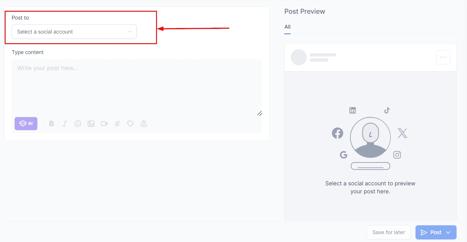 In the content field, draft your social media message, incorporating rich media, hashtags, and engaging content. You can get creative by adding formatting options such as bold or italicized text, images, and even videos before proceeding to publish.