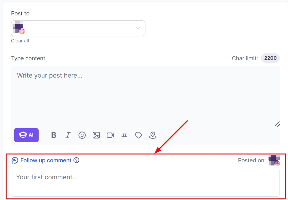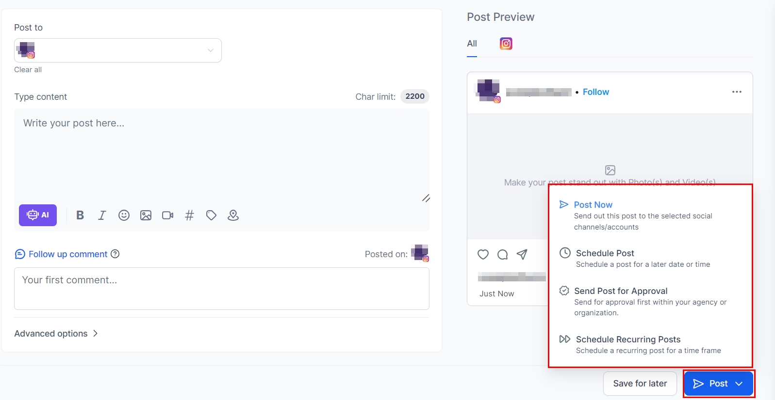 From the "Post To" dropdown menu, select the Instagram account(s) you would like to publish the post. This dropdown will display all the accounts integrated with the platform, allowing you to choose the correct one for your intended audience.