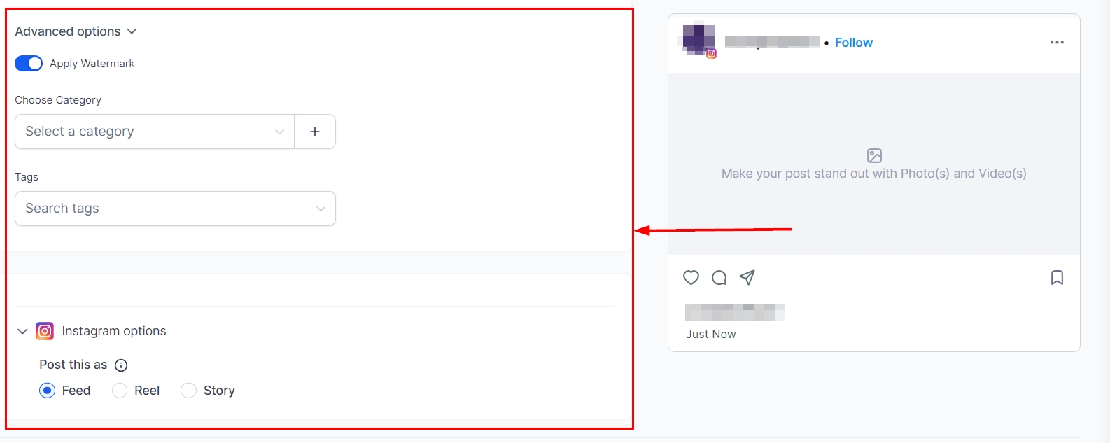 Under Advanced Options, you can apply your watermark to images, choose categories for better organization, and add tags to enhance searchability and categorization of posts. Furthermore, you can choose whether your post should be published on your feed or story, or as a reel.