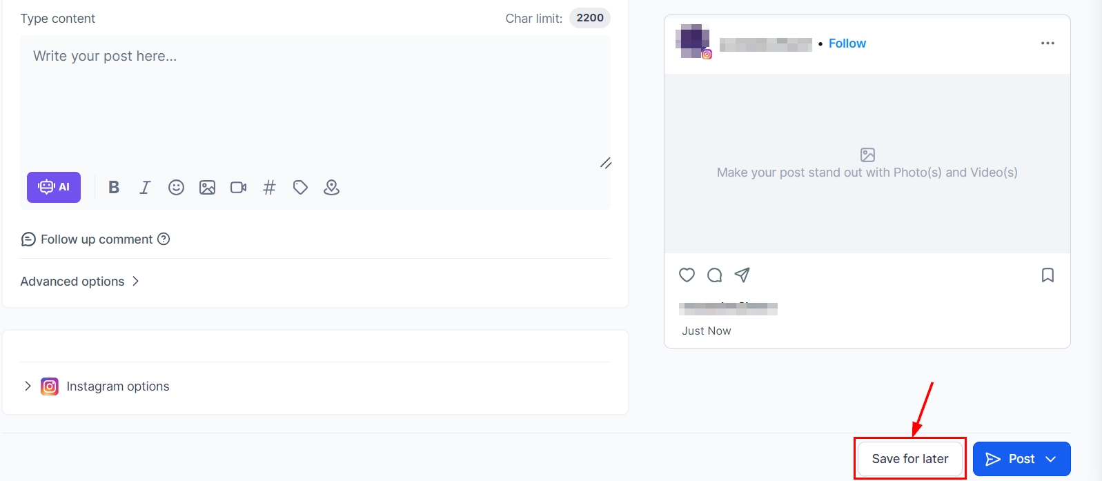 Alternatively, utilize the save for later feature to save your post as a draft for further editing.
