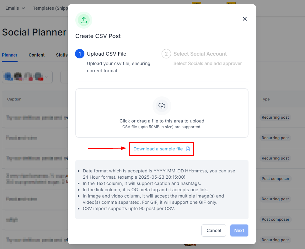 Please keep in mind that your CSV should be properly formatted, you can click “Download a sample file” to get a template of how to format your file.
