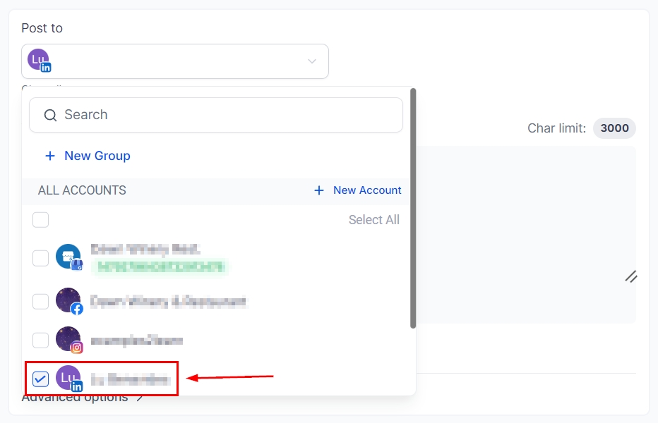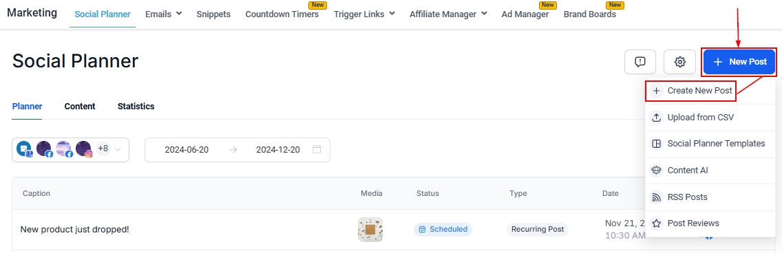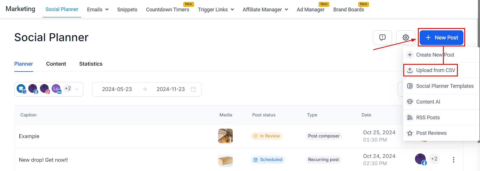 If you have several posts planned you can create them as a CSV file and upload them. By uploading your posts this way you can schedule up to 90 posts per CSV. To start click on the "New Post" button and select the "Upload from CSV" option to direct you to the upload page.