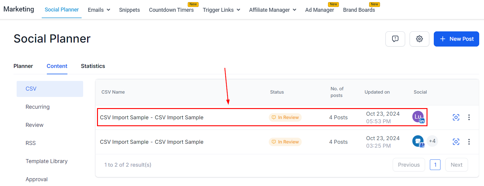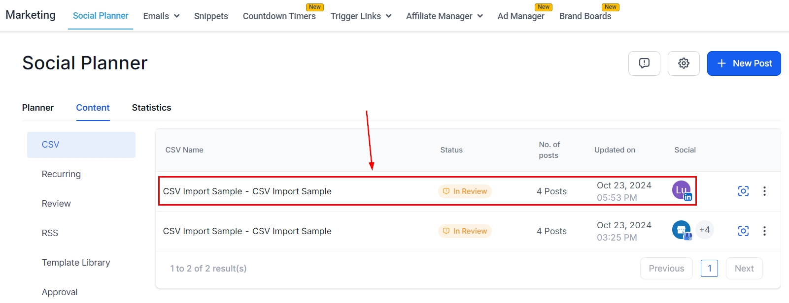 After the posts are imported by clicking on Process CSV, they need to be reviewed by the chosen approver. Once approved, they are scheduled on the social calendar. If no approver is selected they will be scheduled directly.