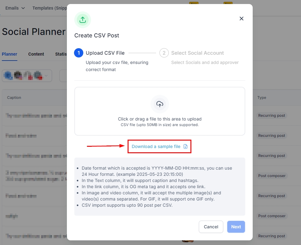 Please keep in mind that your CSV should be properly formatted, you can click “Download a sample file” to get a template of how to format your file.