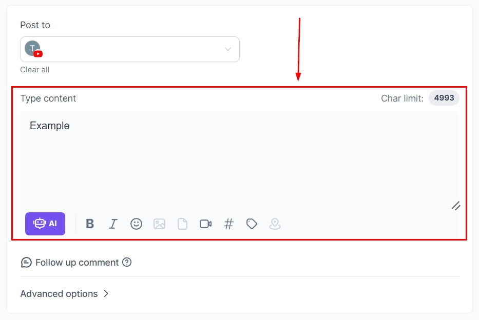 Type in your caption and hashtags, or click the robot icon to use the AI tool to aid you in the content creation. Get creative with adding formatting elements like bolded and italicized text.