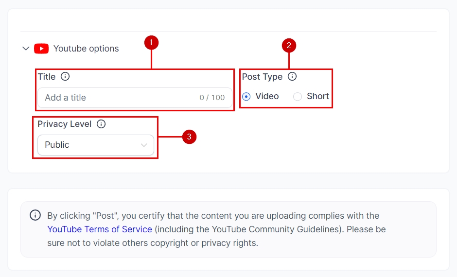 Select the Post Type, please remember that Shorts can't last longer than 60 seconds.