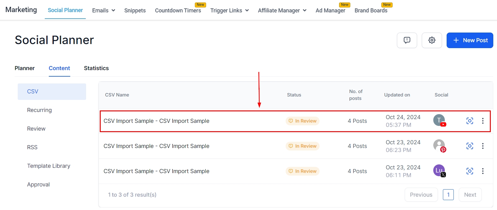 After the posts are imported by clicking on Process CSV, they need to be reviewed by the chosen approver. Once approved, they are scheduled on the social calendar. If no approver is selected they will be scheduled directly.