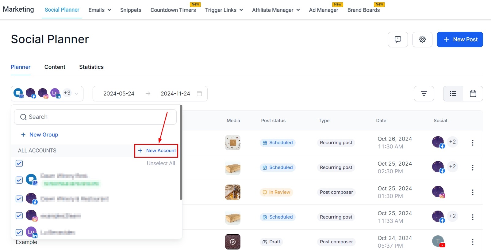 If you have several posts planned ahead of time you can create them as a CSV file and upload them at once. By uploading your posts this way you can schedule up to 90 posts per CSV. To start click on the "New Post" button and select the "Upload from CSV" option to direct you to the upload page.